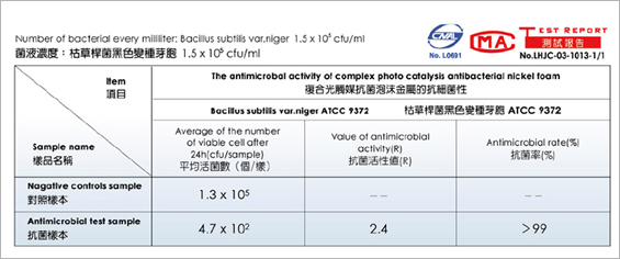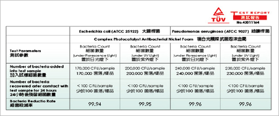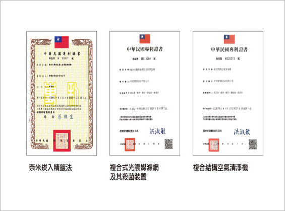 首頁 > 專利技術與實驗報告 關於濟耀光觸媒標章的榮耀光觸媒核心技術專利技術與實驗報告 專利技術與實驗報告獨家專利技術獨家光觸媒奈米崁入精鍍法讓奈米二氧化鈦牢固的鑲崁在鎳金屬表面,產生高接觸高表面積,以達到抗菌除味,長期有效的機制獨家人體環境控制管理讓光觸媒壁掛式空氣淨化機,以智能節能方式,隨時感知室內空間,隨時觸理事內的汙染物質光觸媒標章雙認證確保光觸媒濾網的效能有保障 產品專利技術與檢測報告專利檢測報告、抗菌檢測報告、高效率光觸媒濾網抗菌濾報告 整機實測抗菌效能整機實測超高濃度氨氣報告 回上一頁