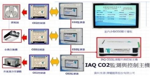 並將數據與控制開關並聯,可啟動排風與新鮮風在室內不同區域解決二氧化碳濃厚過高的問題。